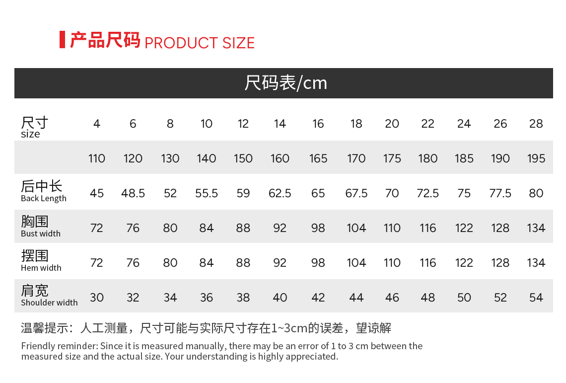 | Size | 4(110/56) or 6(120/60) or 8(130/64) or 10(140/68) or 12(150/72) or 14(160/80A) or 16(165/88A) or 18(170/92A) or 20(175/96A) or 22(180/100A) or 24(185/104A) or 26(190/104A) or 28(195/108A) |