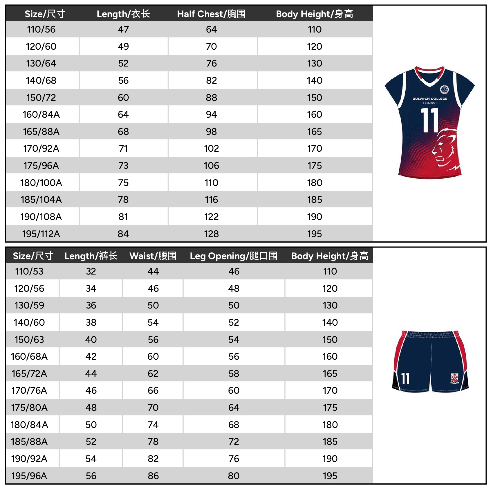 Size 110 or 120 or 130 or 140 or 150 or 160 or 165 or 170 or 175 or 180 or 185 or 190 or 195