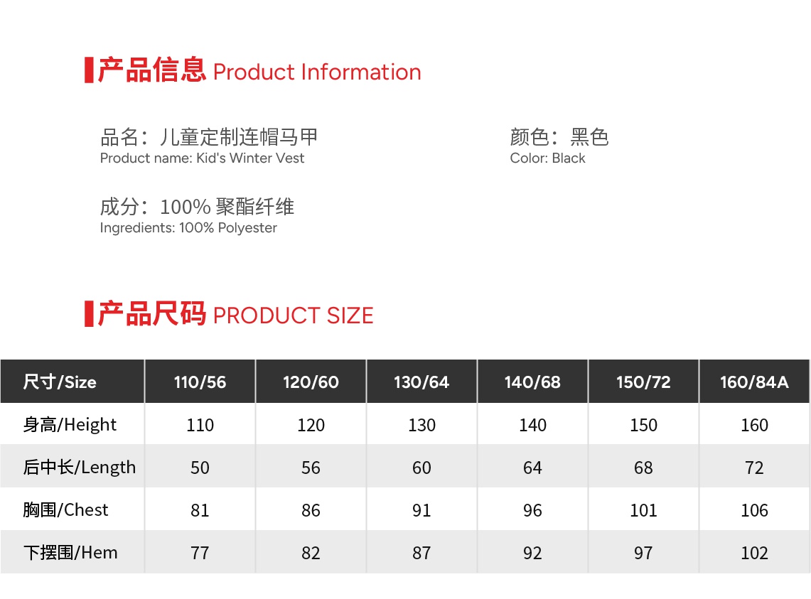 | Size | 110 or 120 or 130 or 140 or 150 or 160 |