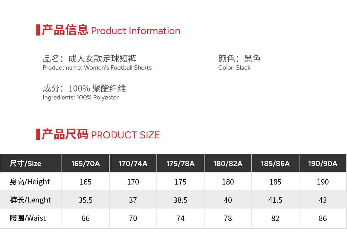 Size 165 or 170 or 175 or 180 or 185 or 190